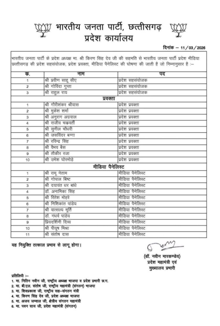 संगठन का विस्तार और प्रमुख नियुक्तियां भाजपा ने मीडिया विभाग को विस्तार देते हुए कई अनुभवी चेहरों को भी नई जिम्मेदारी दी है। नियुक्तियों की सूची में प्रमुख नाम इस प्रकार हैं: