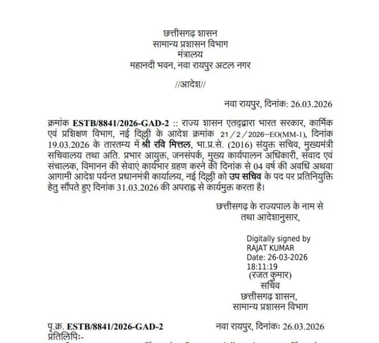कार्यमुक्ति: आदेश के अनुसार, श्री मित्तल 31 मार्च को अपराह्न (Afternoon) वर्तमान दायित्वों से कार्यमुक्त होंगे, जिसके बाद वे दिल्ली में अपनी नई जिम्मेदारी संभालेंगे।