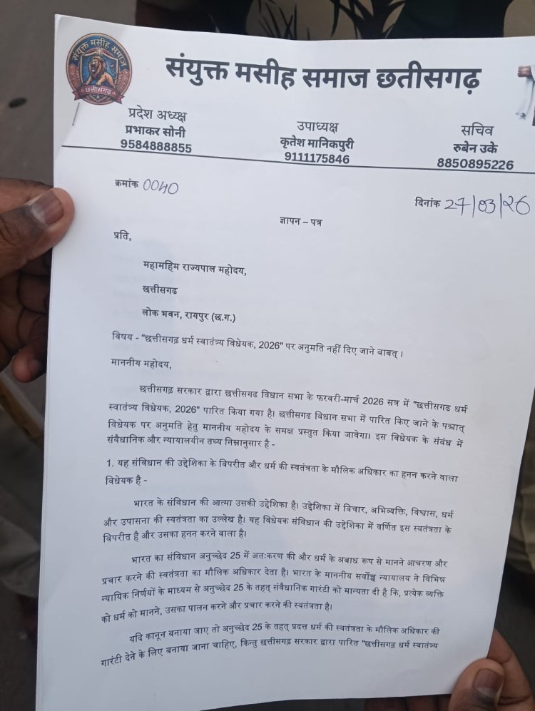 रायपुर : छत्तीसगढ़ सरकार द्वारा पारित 'धर्म स्वातंत्र्य विधेयक 2026' के खिलाफ मसीही समाज का आक्रोश सड़कों पर उतर आया है। शुक्रवार, 27 मार्च को 'संयुक्त मसीही समाज छत्तीसगढ़' के बैनर तले प्रदेशभर से आए लाखों लोगों ने राजधानी रायपुर में विशाल प्रदर्शन किया और राजभवन का घेराव करने के लिए कूच किया। प्रदर्शनकारियों ने इस विधेयक को "काला कानून" करार देते हुए इसे तत्काल वापस लेने की मांग की है।