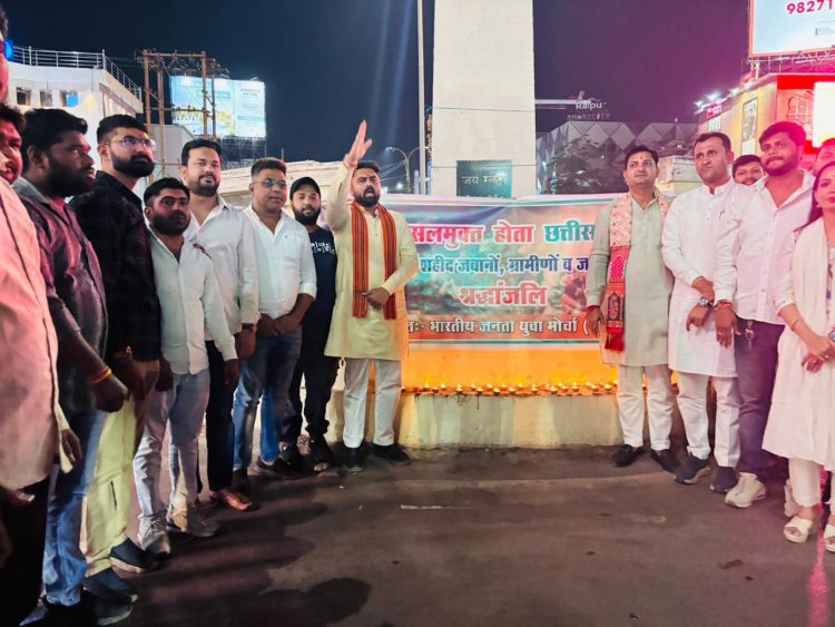छत्तीसगढ़ के नक्सल मुक्त होने की ऐतिहासिक अवसर पर जिला मुख्यालयों में वीर जवानों की स्मृति में श्रद्धांजलि एवं दीपदान कार्यक्रम आयोजित किया गया। इसी तत्वधान में भाजपा रायपुर शहर जिला द्वारा जय स्तंभ चौक में वीर जवानों को श्रद्धांजलि अर्पित कर दीपदान किया गया। इस दौरान भाजपा जिला महामंत्री अमित मैशेरी, जिला उपाध्यक्ष अकबर अली, भाजयुमो प्रदेश मंत्री विशाल पांडे, भाजयुमो जिला अध्यक्ष अर्पित सूर्यवंशी, प्रणय साहू, शंकर साहू, उपाध्यक्ष आशीष आहूजा, राहुल यादव, प्रदेश कन्या शक्ति संयोजिका अन्नू ठेठवार, अन्वेष पांडे, विशाल शुक्ला , कृष्ना देवांगन ,गुरमीत सिंह , सत्यम पांडे, अनुराग साहू , विजय रेलवानी मंडल अध्यक्ष राज गायकवाड़ , शुभांकर द्विवेदी, जितेंद्र साहू , राहुल वर्मा , भरत कुंडे , मनीष साहू , योगी साहू , संजय नागर , सोनू रेलवानी , प्रशांत जगत , सौरभ वर्मा मौजूद रहे।