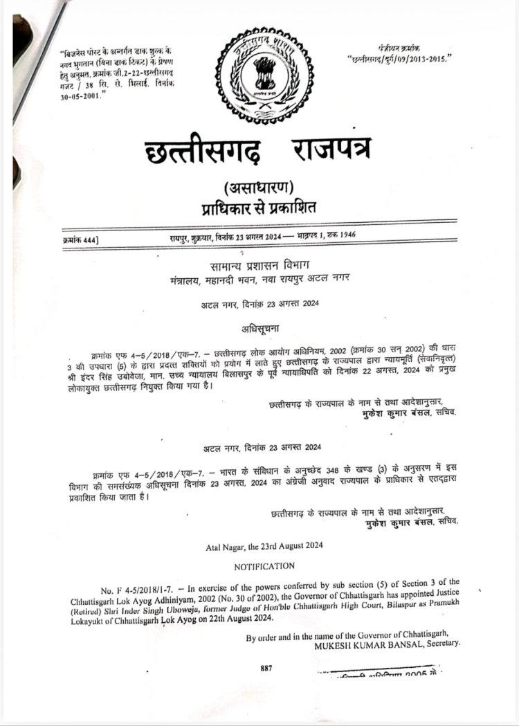 रायपुर : सेवानिवृत्त न्यायाधीश श्री इंदरसिंह उबोवेजा की 'प्रमुख लोकायुक्त' पद पर हुई नियुक्ति को 'अवैधानिक' बताते हुए छत्तीसगढ़ लोक आयोग में एक औपचारिक शिकायत प्रस्तुत की गई है। यह शिकायत छत्तीसगढ़ नागरिक कल्याण समिति के सचिव अविनाश साहू द्वारा दर्ज कराई गई है।