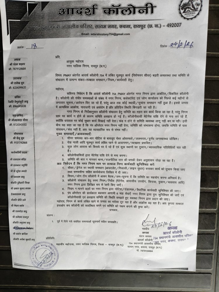 नगर निगम के निर्देशानुसार कॉलोनी संचालन के लिए एक समिति का गठन भी किया गया है, ताकि व्यवस्थाओं को सुचारु किया जा सके। बावजूद इसके, सीवर सहित अन्य बुनियादी कार्य अधूरे पड़े हैं, जिससे संचालन में भी संकट उत्पन्न हो गया है।
