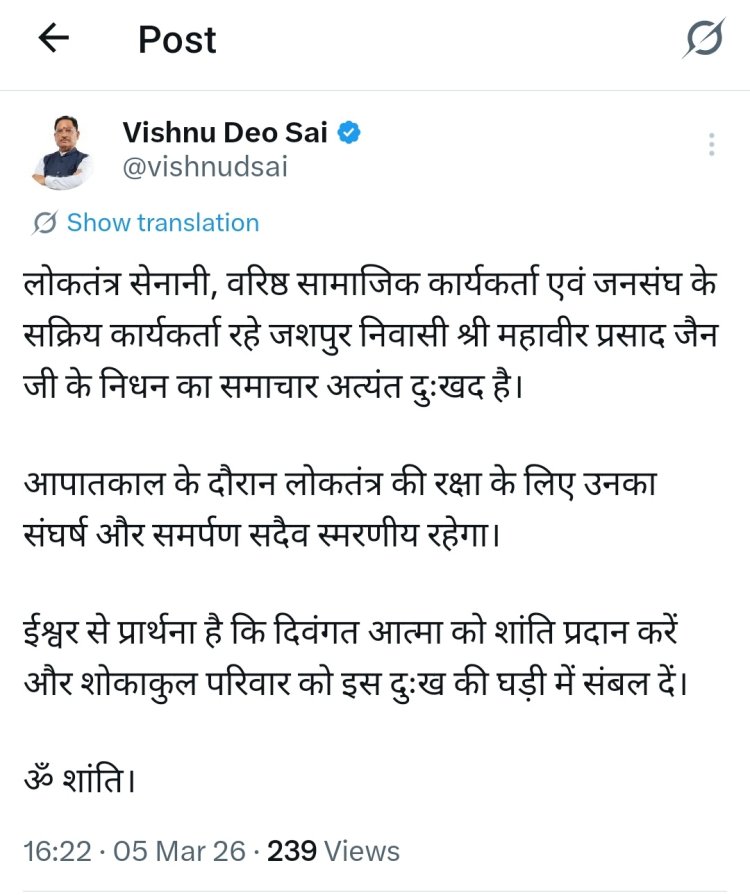 मुख्यमंत्री विष्णु देव साय ने लोकतंत्र सेनानी महावीर प्रसाद जैन के निधन पर जताया शोक ...