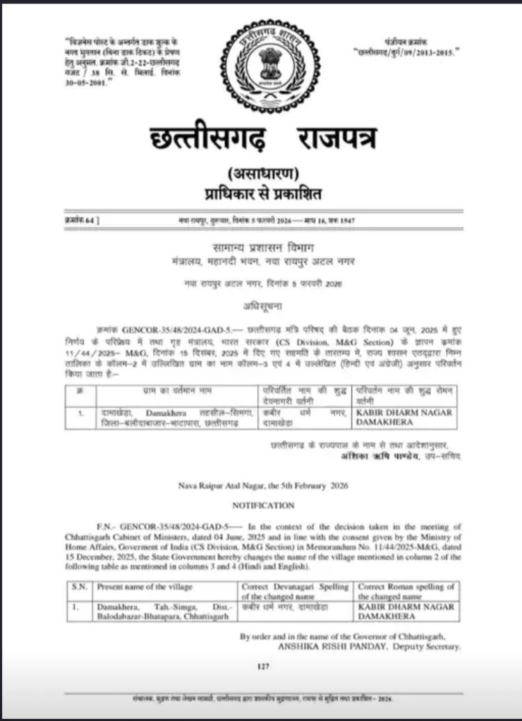* अधिसूचना: सामान्य प्रशासन विभाग ने 5 फरवरी 2026 को छत्तीसगढ़ राजपत्र (Gazette) में इस संबंध में आधिकारिक अधिसूचना जारी कर दी है।